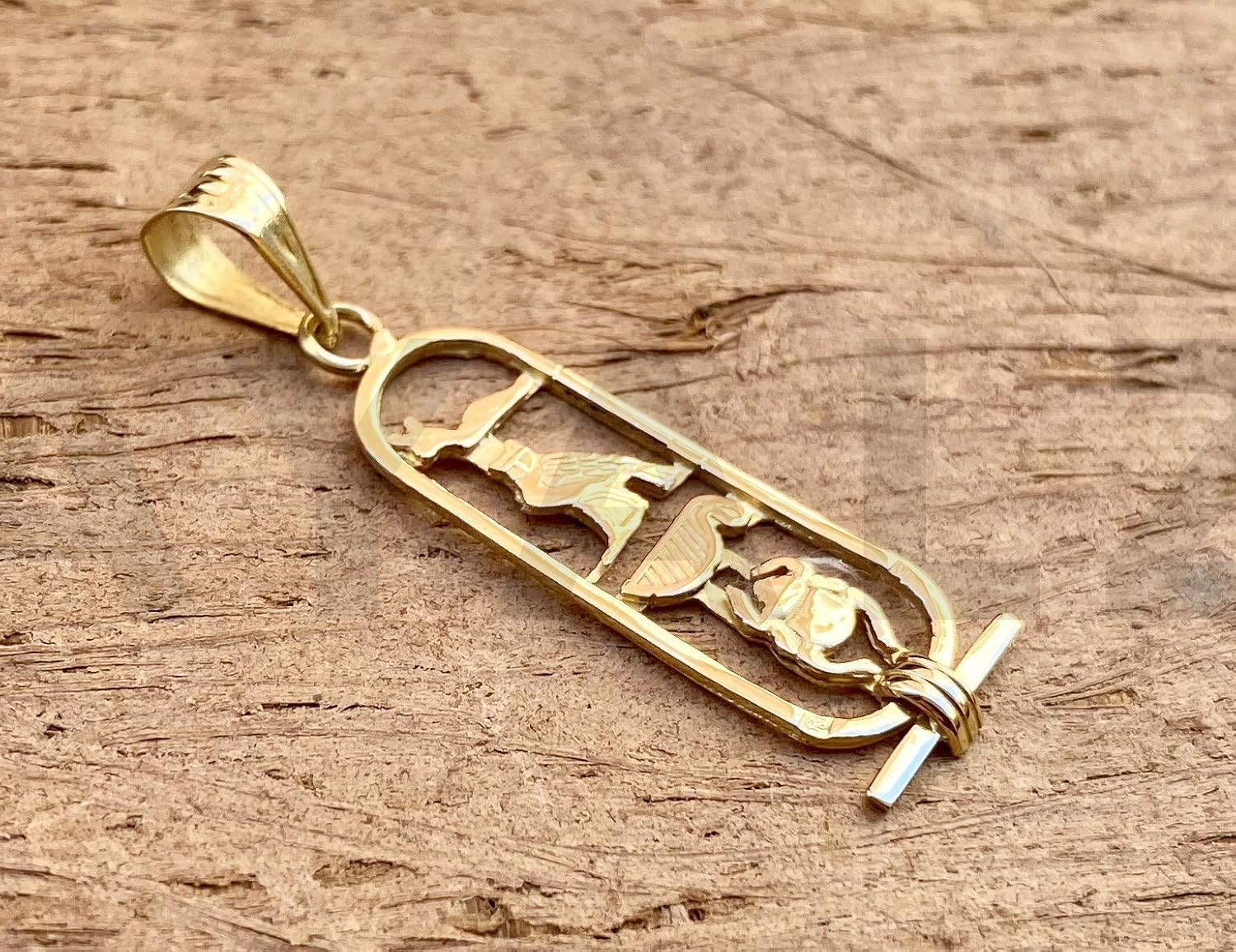 The posted photos represent samples of our wide collection. Cartouche personalization allows up to five characters (or 6 or 7 characters if the name contains characters like ou or th, which are translated to one symbol in ancient egyptian hieroglyphs); A perfect gift fit everyone and any occasion. Handmade in egypt, yours will bear your name (or someone else's), spelled out in hieroglyphic characters. See more ideas about egyptian jewelry, cartouche pendant, gold.