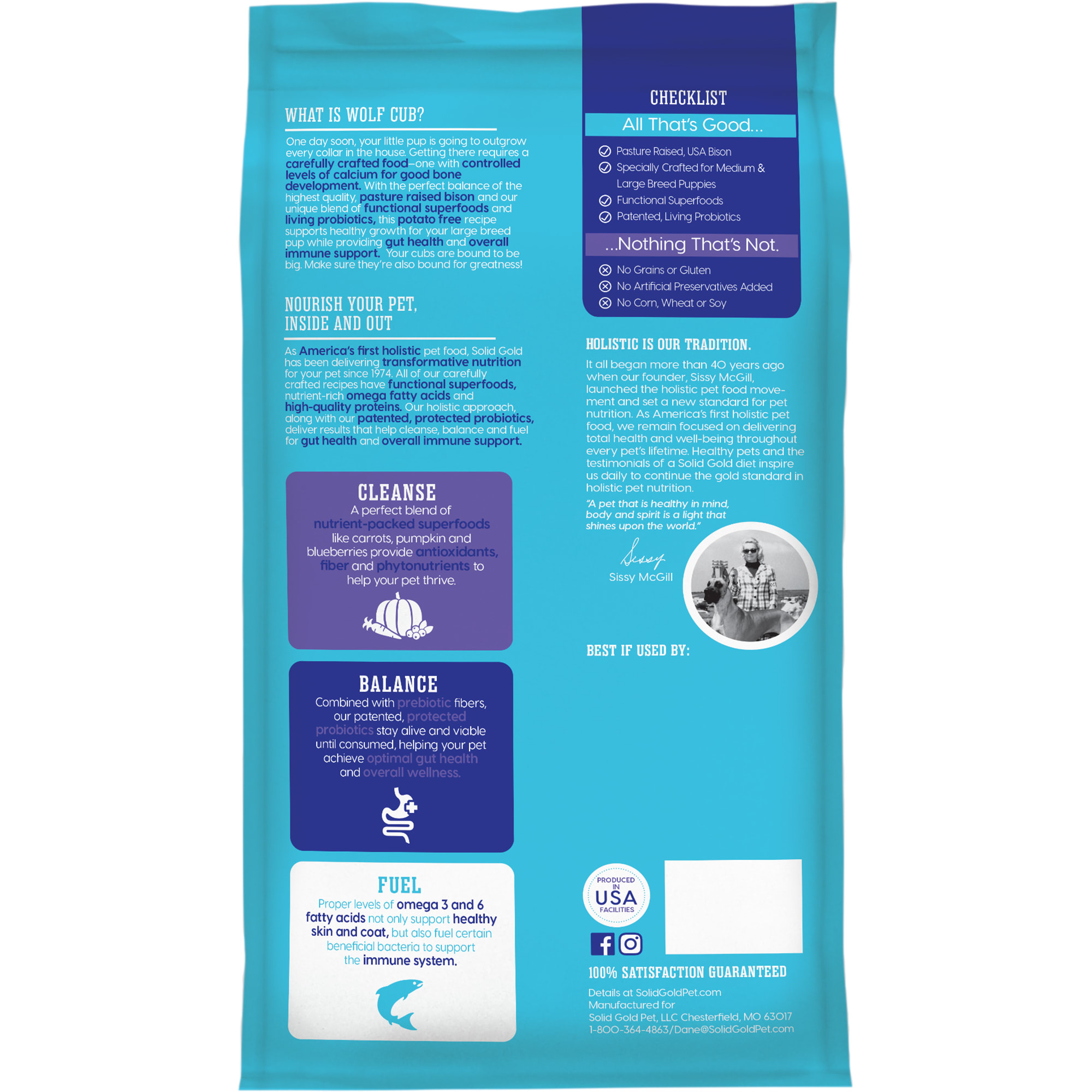 Solid Gold Wolf Cub : Solid Gold Wolf Cub with Bison Dry Puppy Food - GotPetSupplies.com. Solid gold follows a holistic approach to pet nutrition in the formulation of their recipes which means that they carefully select ingredients that will nourish your dog's body from the inside out. Solid gold wolf cub bison & oatmeal puppy food. Dhigh energy diets, like most puppy foods, can promote rapid growth in large breed puppies, which can play a role in the development of orthopedic diseases. The remaining ingredients in this solid gold wolf cub recipe are unlikely to affect the overall rating of the product. Solid gold wolf cub large breed puppy food.